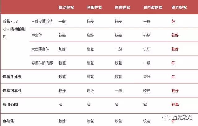 除了以上四种是主要的塑料焊接方法,目前还有一种新型的焊接方式——塑料激光焊接,下面我们先来看与传统焊接技术相比,塑料激光焊接到底有哪些突出的地方?如下表