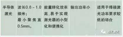 二、半导体激光焊接的光源在激光焊接工艺中,随着半导体材料工业的快速发展,半导体激光作为光源也渐渐得到了应用。焊接的特点如表1所示: