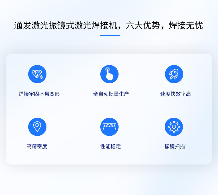 1、采用高速扫描振镜进行激光定位,速度可达7000mm/s,极大的降低了焊接位置之间的空走时间,从而大大的提高生产效率;