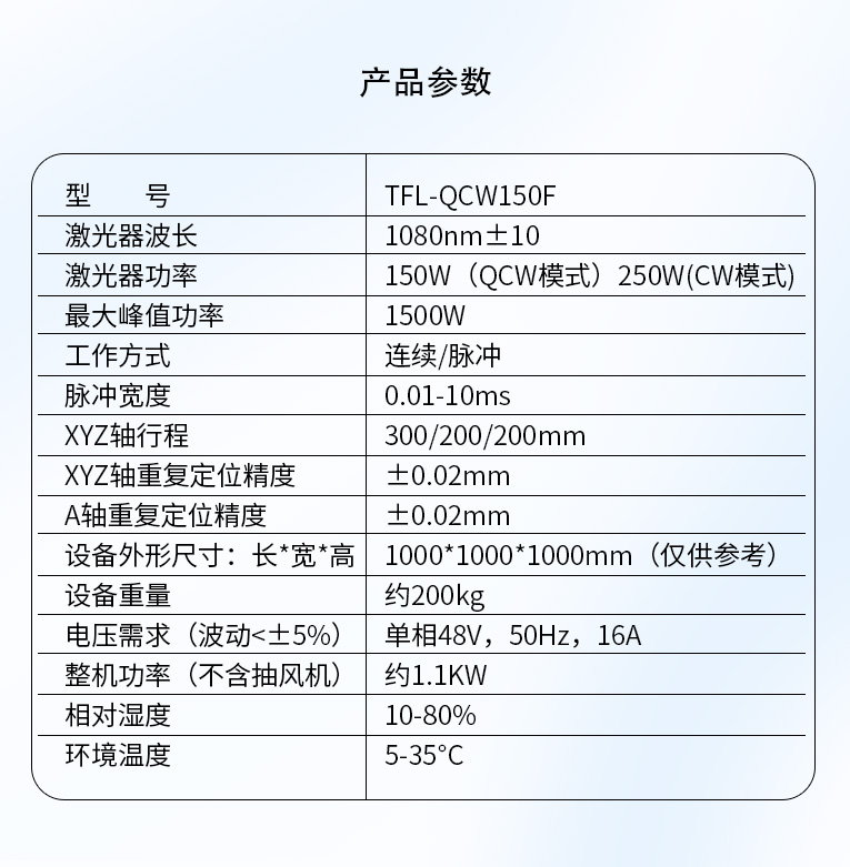 激光器功率 | 150W(QCW模式)250W(CW模式) |